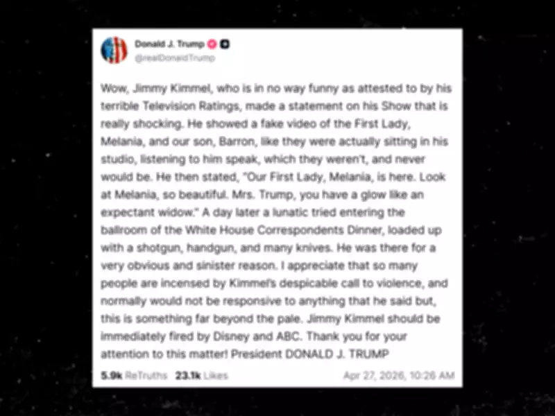 President Donald Trump has escalated his dispute with late-night host Jimmy Kimmel by calling for his immediate dismissal. The demand follows Kimmel's jokes about First Lady Melania Trump during a parody segment tied to the White House Correspondents' Dinner. In a post on Truth Social on Monday, April 27, Trump criticized Kimmel's performance and television ratings, accusing him of airing misleading content. The president argued that the remarks took on a more serious tone after a security incident days later, when authorities said an armed suspect attempted to breach the event venue. Trump described the situation as dangerous and accused Kimmel of contributing to a climate of hostility.