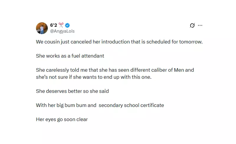 According to an X user named AngyaLois, her cousin, who works at a fuel station, made the surprising move on the eve of her introduction ceremony. The event, a significant pre-wedding tradition in many Nigerian cultures where families formally meet, was set for January 2, 2026. The cousin reportedly informed AngyaLois of her decision in a casual manner, leading to the online revelation.