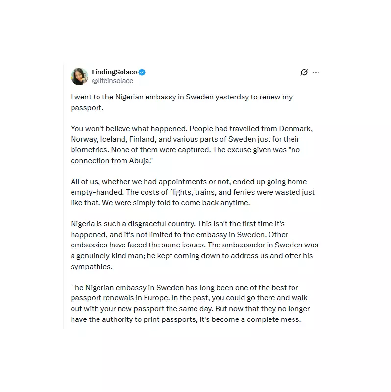 The incident occurred two days prior to her post, when she and other Nigerians arrived at the embassy in Sweden. According to her testimony, individuals had journeyed from countries such as Denmark, Norway, Iceland, Finland, and various regions within Sweden specifically to complete their biometrics for passport renewal or issuance. To their dismay, all were informed that the process could not proceed due to technical issues described as "no connection from Abuja."