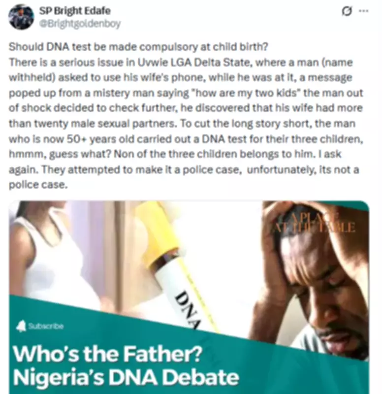 Edafe's post emphasized this point, stating, "They attempted to make it a police case, unfortunately, it's not a police case." This statement has sparked widespread discussion on whether current laws and policies adequately address the ramifications of paternity fraud, or if new regulations, such as mandatory DNA testing, are necessary to protect individuals from such deceit.